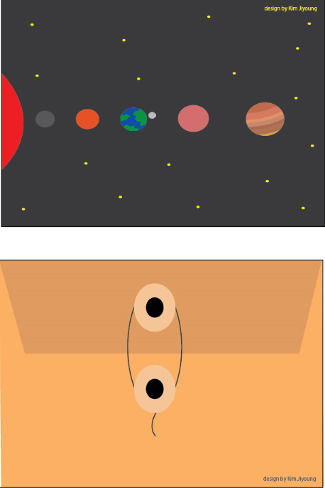 태양, 수성, 금성, 지구, 화성, 목성이 있는 태양계를 그리기